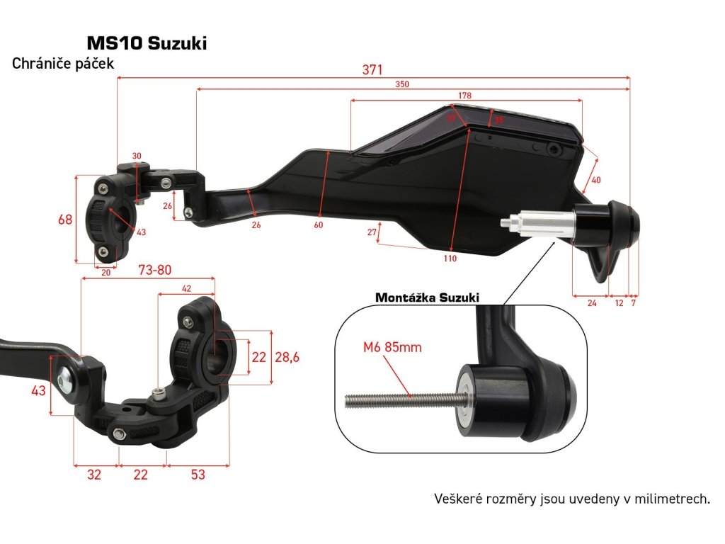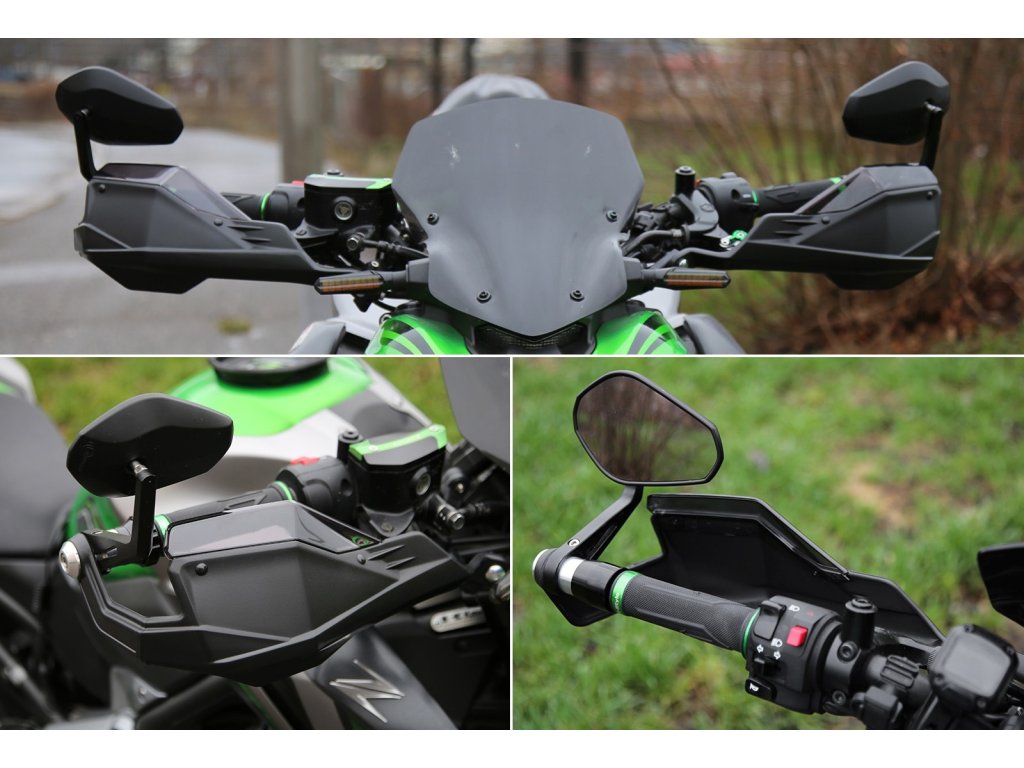 - balení obsahuje: 2x tělo chráničů, 2x montážní sada s objímkou, 2x montážní sada do řídítka, 2x plexi navýšení, 4x krátký čep, 4x dlouhý čep